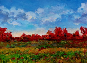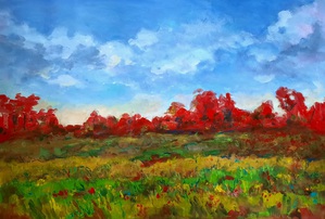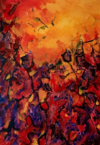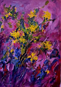 2022Vanuit een ondergrond van ultramarijn blauw en karmijnrood onstond geleidelijk dit beeld. Gele bloemen opgestuwd door een verlangen om hoger te reiken.