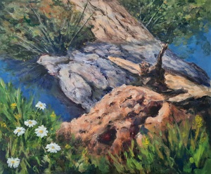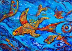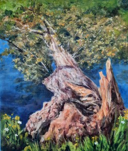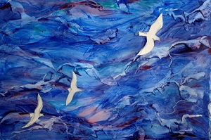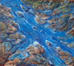 2020Geïnspireerd door een mooie, verheffende, spirituele tekst geef ik me over aan mijn gevoel. Stapje voor stapje, laag over laag, gebruikmakend van een sponsje, penselen en een paletmes ontstaat dit werk. Van onderaf, omhoog, totdat het goed voelt.