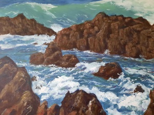 2017Brekende golven op rotskust.